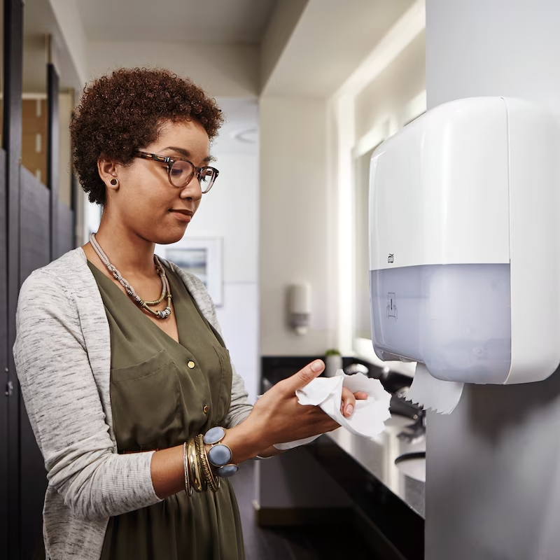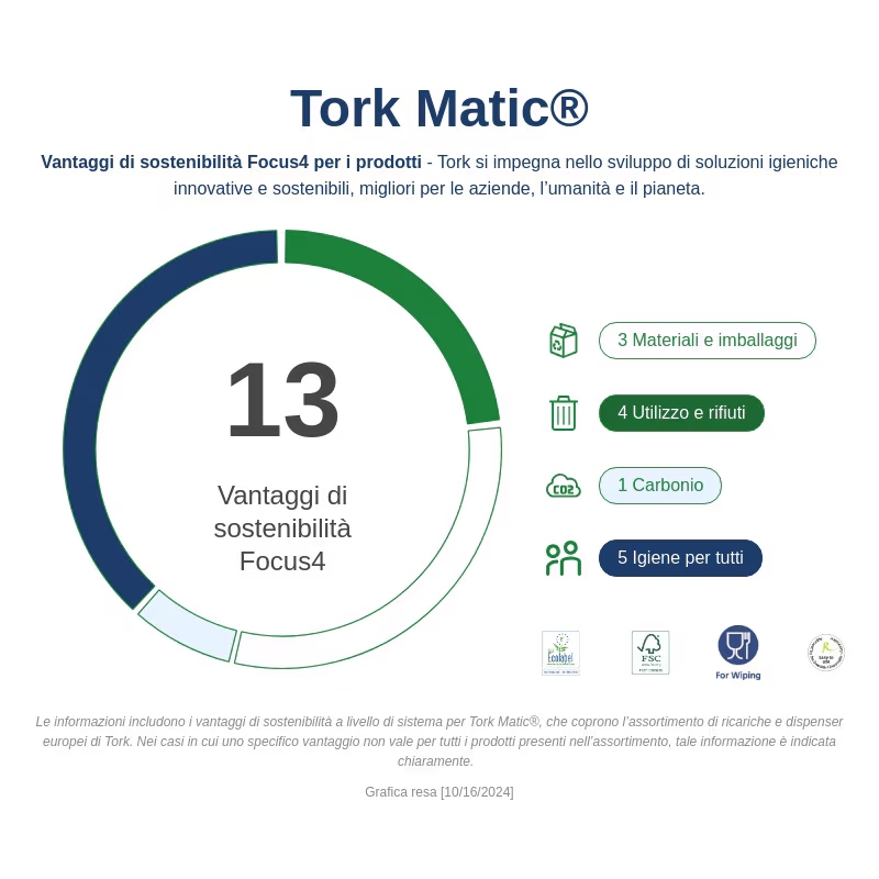 Il sistema di erogazione singola dei dispenser Tork Matic® H1 consente di ridurre i consumi e migliorare l’igiene, poiché ogni utente entra in contatto solo con il foglio utilizzato. I rotoli sono progettati per offrire elevata autonomia, riducendo la frequenza delle sostituzioni e ottimizzando i tempi di manutenzione.